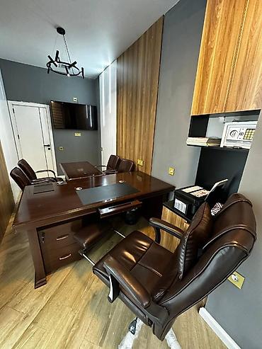 - İş masasının dəsti: geniş rəhbər masası (yan çekmecəli pedestal, qələm/kağız üçün üst yazı altlığı), qarşısında kiçik görüş masası