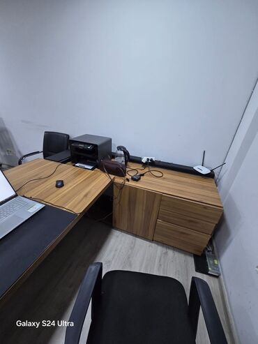 Qeyd: Şəkillərdə laptop, printer və dekorativ əşyalar görünür; dəst əsasən göstərilən mebel elementlərindən ibarətdir.
