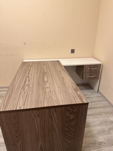 Ofis mebel dəsti Tərkib: - Geniş əmək masası – düz xəttli dizayn, ön paneldə qara dekor elementləri - Yan “L” tipli köməkçi masa (kompyuter, printer və ya sənədlər üçün) - Kiçik jurnallıq/qarşılam...