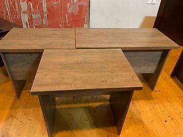 - İş masaları: müxtəlif ölçülü, düzüstü kompüter və sənədlərlə rahat işləmək üçün geniş səth. Bəzi masalarda sağ tərəfdə 3 çekmece, üst çekmecədə açarlı kilid. Taxta teksturalı qəhvəyi/valnüt tonları.