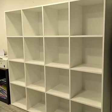 Ağ rəngli divar rəfi – modul dizayn - Material: ağ laminat - Dizayn: bir-biri ilə kəsişən 5 kvadrat/ düzbucaqlı bölmədən ibarət asimmetrik kompozisiya - İstifadə sahələri: qonaq otağı, yataq otağı...