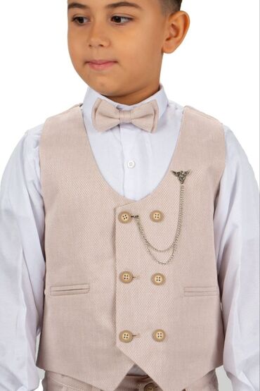 Uşaqlar üçün bu cins jilet gündəlik istifadə üçün uyğun olan klassik dizayna malikdir. Jiletin düymələri və ön tərəfində iki cib var. Kənarları və yaxası tikilmişdir. Geyimə şleyf də daxildir. Bu d...