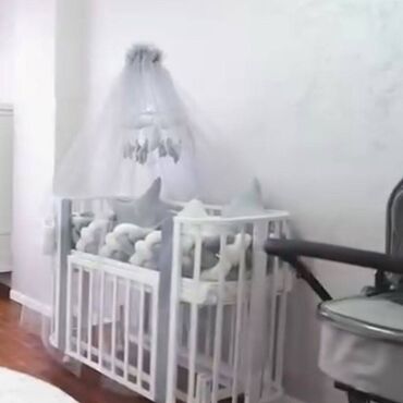 Uşaq beşik-çarşı komplekti - Ölçü: standart uşaq beşiyi (krovat) – geniş iç hissə, rahat yatırma üçün. - Material: ağ rəngli MDF/taxta konstruksiya, ön panel boz rəngdə dekorativ tac naxışı ilə. -...