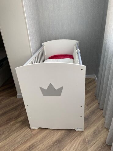 Uşaq beşiyi – Aymİni - Rəng: krem/çiğəl ağ - Material: MDF/taxta konstruksiya - Ön tərəfdə sürüşən qoruyucu rels (yuxarı‑aşağı hərəkətlidir) - Alt hissədə 2 iri çekmece – paltar və aksesuar saxlam...