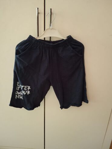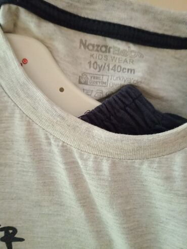 Nazar Bebe markasına aid, 10 yaş (140 sm) uşaqlar üçün nəzərdə tutulmuş boz rəngli qısaqol köynək və tünd göy rəngli şort dəsti. Köynəyin üzərində və şortda yazılar var.