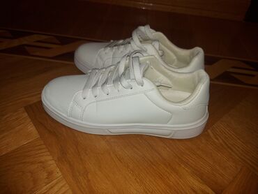 Ağ dəri idman ayaqqabıları, gündəlik istifadə üçün idealdır. Qara rəngli iç hissəsi və ağ rəngli bağları var. Rahat və dəbli görünüşü ilə hər geyimə uyğunlaşa bilər.