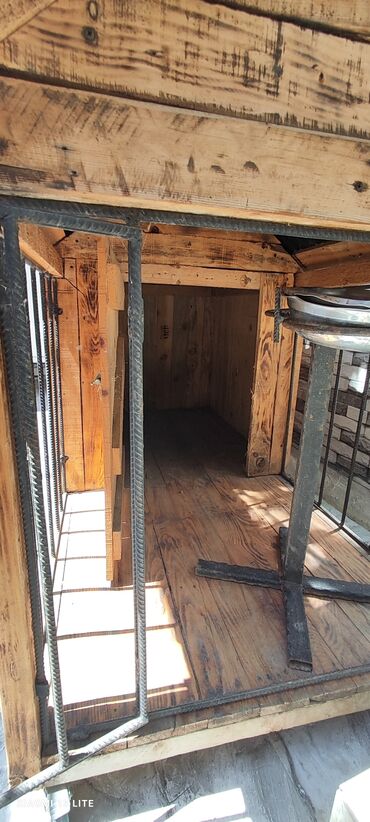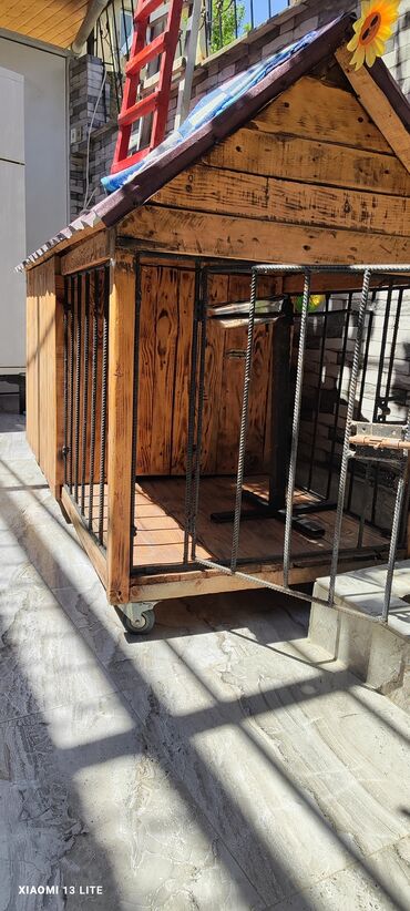 Taxta it evi - Material: qalın taxta lövhələr, üstü faner/kontrplak damla örtülüb - Ölçü: orta ölçülü itlər üçün rahat daxili məkan (giriş qapısı taxta tağlı) - Konstruksiya: yerdən bir qədər hünd...