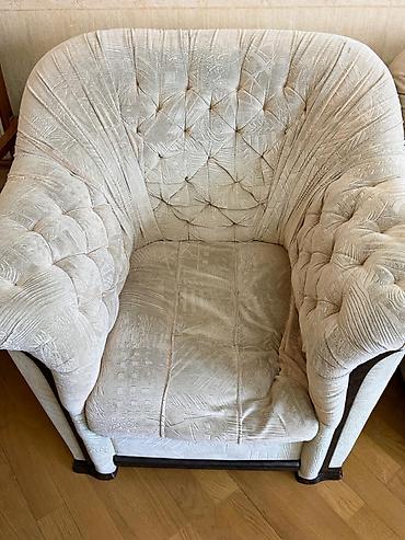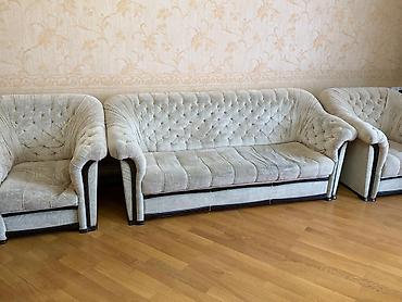 divan - Klassik, düz xətli dizayn: Hündür bel hissə, enli qol dayaqları, dekorativ tikişlərlə bölünmüş oturacaq və arxa hissə. - Material: Yumşaq toxumalı parça (müxtəlif rənglər – boz, göy, qəh...