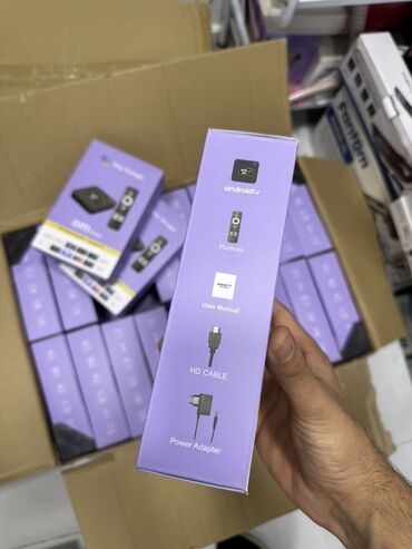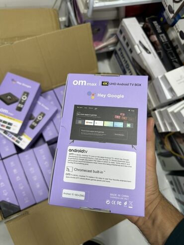 - Qutuda: OM Max TV box, uzaqdan idarəetmə pulti, istifadə təlimatı, HD (HDMI) kabeli, enerji adapteri