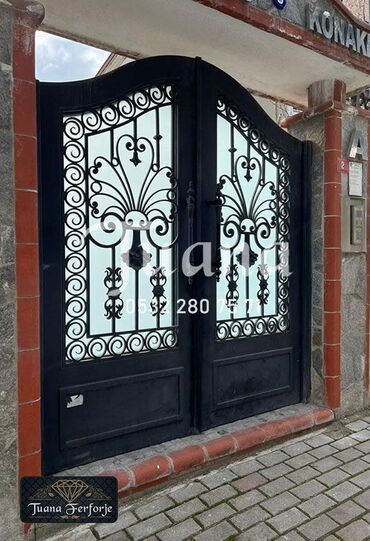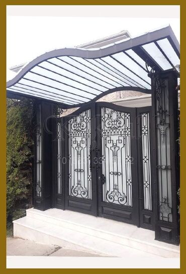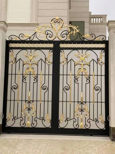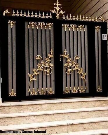 Dekorativ metal darvazalar və giriş qapıları - Material: metaldan hazırlanmış, dekorativ relyef və qızılı ornamentlər, rəngli panellərlə kombinasiya olunmuş dizayn - Komplektlər: 1) İkiqanad dar...