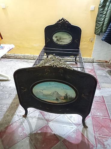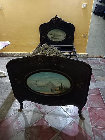 Tek nəfərlik taxta çarpayı – başlıqlı, rəngli naxışlı döşəmə hissəsi ilə - Ölçü: təxmini 90–100 sm en, 80*195 sm uzunluq (fotolardakı model). - Karkas: möhkəm taxta konstruksiya, kvadrat formalı d...