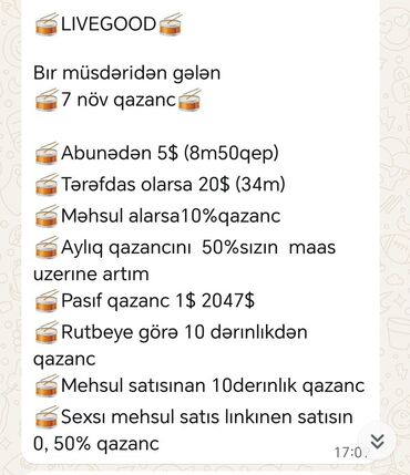 Məhsul/xidmət: 🌍 Dünyanın ən sürətli böyüyən platforması indi Azərbaycanda! 🌱 LiveGood – 2025-in ən çox qazandıran biznes platforması! Evdə otur, gəlir qazan və komandana yeni insanlar əlavə et. ...