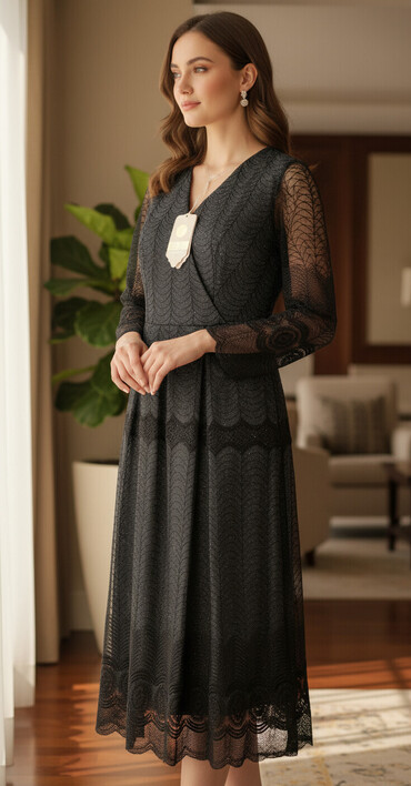 Detallı işlənmiş dantel qollar və parlaq tekstura donu həm zərif, həm də diqqətçəkən edir.