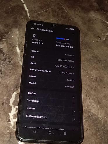 OPPO A18 (Model: CPH2591) – smartfon Əsas xüsusiyyətlər: - Ekran: 6.56 düym - Prosessor: MediaTek Helio G85 - RAM: 4 GB (+ əlavə 4 GB virtual RAM) - Yaddaş: 128 GB - Batareya: 5000 mAh (tipik) - ...