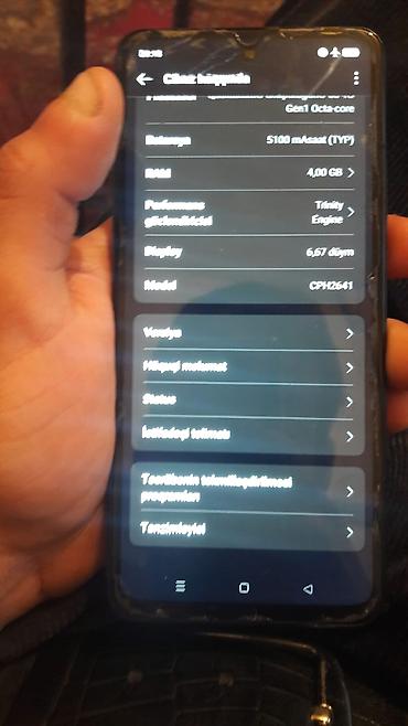 Oppo smartfon - Model: CPH2641 (Oppo) – arxa hissədə qeyd olunub - Rəng: Açıq mavi - Ekran: Tam ekran, mərkəzdə “hole‑punch” ön kamera kəsiyi - Arxa kamera sistemi: Kvadrat modulda iki böyük obyek...