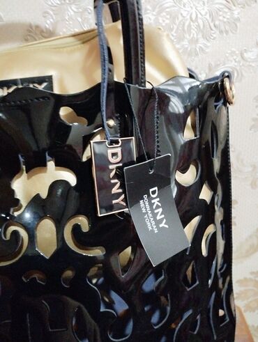 DKNY(original) brendinə məxsus qara rəngli, yarımdairəvi çiyin çantası. Çanta qırmızı ürək və sarı taksi dizaynı ilə bəzədilmişdir. Üst hissəsində qızılı rəngdə DKNY loqosu yerləşir. Uzun, nazik çi...