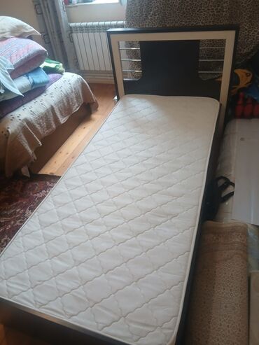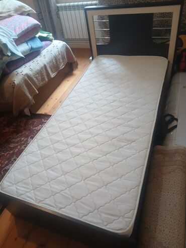 Tək nəfərlik çarpayı və döşək dəsti - Ölçü: standart tək nəfərlik (təxmini 90x190 sm) - Karkas: möhkəm metal lamellərdən ibarət əsas, kənarları taxta/MDFlə üzlənmiş çərçivə - Başlıq və ayaqlıq: ey...