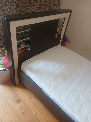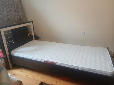 Tək nəfərlik çarpayı və döşək dəsti - Ölçü: təxmini 90x190 sm tək çarpayı - Korpus: qoz rəngli lamina, möhkəm karkas - Başlıq: ağ və qoz kombinasiya, modern xətli dizayn - Döşək: ortopedik tipli, ...
