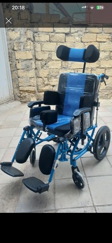 Uşaq üçün xüsusi reabilitasiya təkərli kürsüsü - Konstruksiya: möhkəm yüngül metal şassi, mavi rəngli çərçivə - Oturacaq və arxalıq: yumşaq yastıqlı, yan və bel dəstəkləri ilə səviyyələnən quruluş...