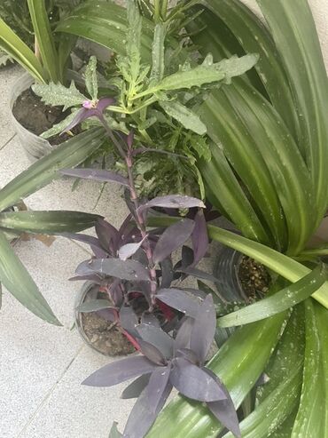 - Bənövşəyi yarpaqlı Tradescantia və digər sukulent/şirəli tərkibli kompozisiya saksıları – ətirsiz, asan qulluq tələb edən otaq bitkiləri. Parlaq diffuz işıq və orta suvarma ilə rənglərini qoruyurlar.