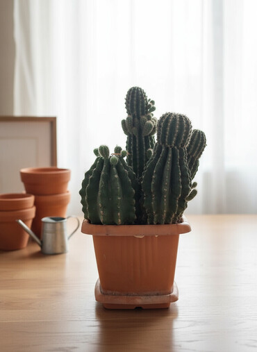 Növ: Süs kaktusu (çoxgövdəli, xırda tikanlı) Qabı: Tond rəngli keramika dibçək (altlığı ilə) Ümumi ölçü: Təxminən orta-böyük kol formasında, sıx pöhrəli Təsvir: - Dekorativ, sıx budaqlanan kaktus ...