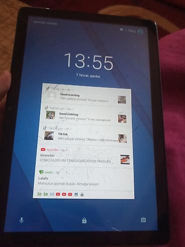 Qeyd: Şüşə səthində çoxsaylı çatlar görünür. Ekran açılır, sensor işləkliyinə dair təsvirlərdə toxunuşla kilid/menyu ikonları görünür. Arxa panel təmiz, iki kameranın yerləşdiyi kvadrat ada mövcuddur. SIM kart daxil deyil.