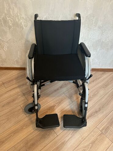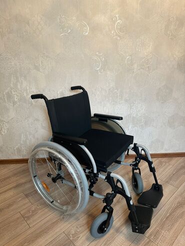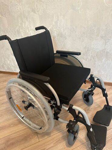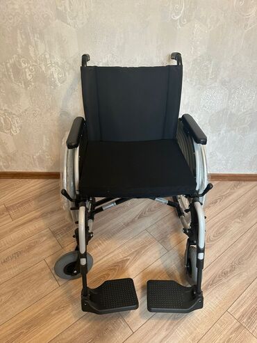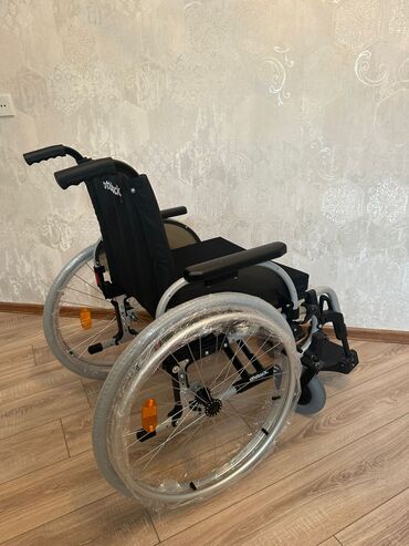 MOBIAK manual əlil arabası - Material: möhkəm metal şassi, vinil/deri oturacaq və bel dayağı - Təkərlər: ön tərəfdə manevr üçün 2 ədəd kiçik fırlanan təkər, arxada 2 ədəd böyük şinli təkər (əl hal...