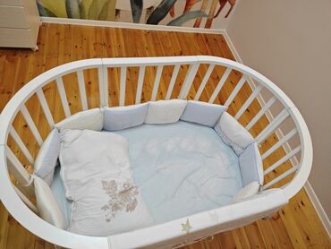- Ölçü: geniş oval yatma sahəsi (2–3 yaşa qədər körpələr üçün münasib ölçüdə; real ölçü şəkillərə əsasən standart oval beşik formatındadır)