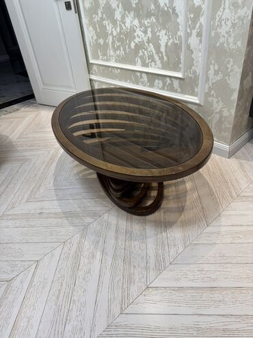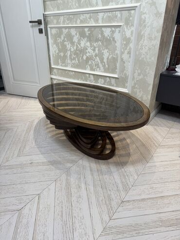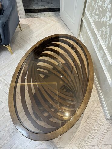 - Təxmini ölçü təsviri: aşağı profilli, geniş oval üst (fotolara əsasən orta ölçü qonaq otağı üçün uyğundur).