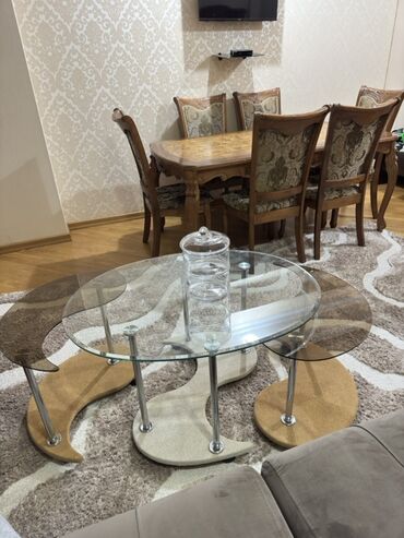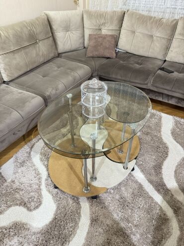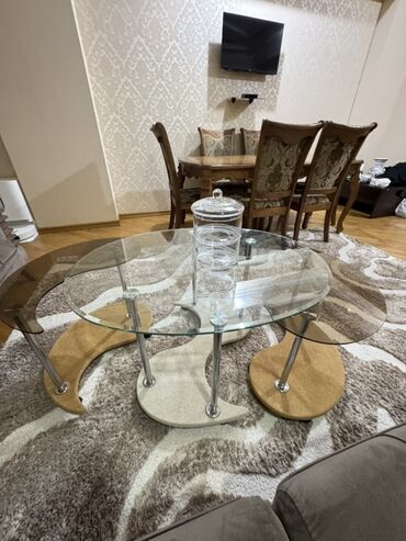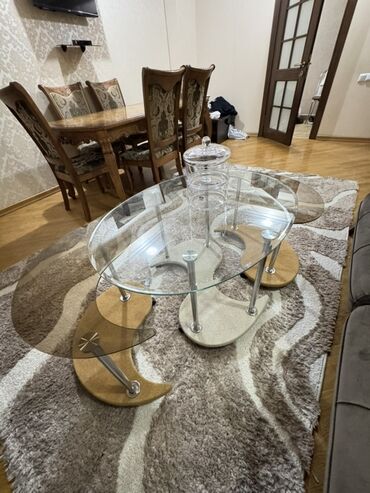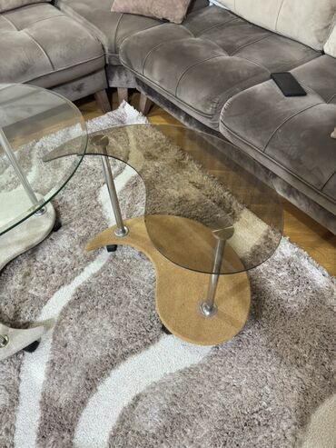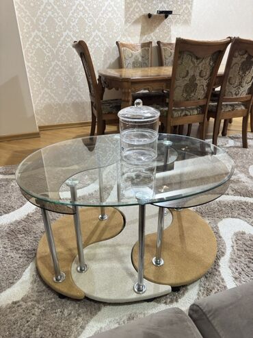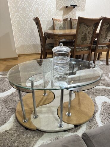- Materiallar: Temperlənmiş şəffaf şüşə üst panel, xromlaşdırılmış metal dayaqlar, aşağıda bej və karamell rəng tonlarında MDF/laminat panellər.