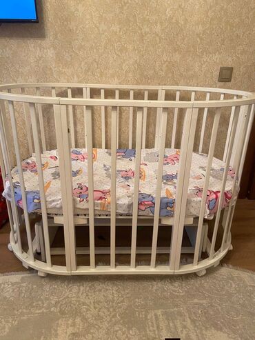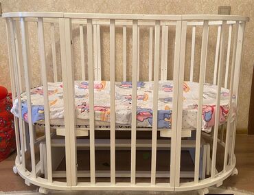 Oval formalı transformasiya olunan beşik - Material: ağ rəngli taxta karkas, dayanıqlı relslər - Forma və quruluş: oval/yuvarlaq dizayn, geniş yatma sahəsi - Funksionallıq: aşağı hissədə quyruqvar...