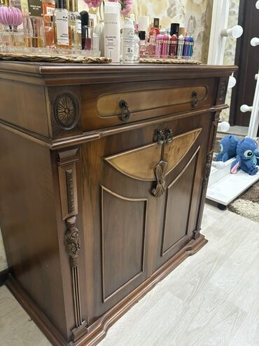 Klassik üslubda böyük güzgülü makiyaj/tuvalet masası - Material: massiv ağacdan hazırlanmış, oyma dekorlu və naxışlı fasadlar, qoz rəngli lak örtük - Komplekt: iri ölçülü dekorativ çərçivəli güzgü...