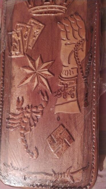 - Dizayn: hər iki üzündə relyef oyma motivlər; iç hissədə yanan naxış texnikası ilə təsvirlər