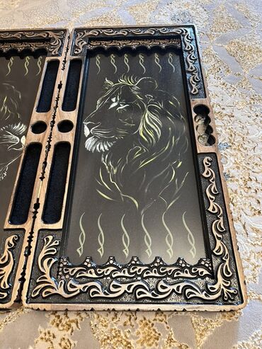 - Daxili hissə: şüşə/kompozit lövhə üzərində şir (aslan) təsviri ilə bəzədilmiş iki oyun sahəsi