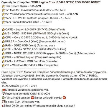 Oyun üçün Kompüter "RGB Legion Core i5 3470 GT730 2GB 256GB NVME” ⭐Tək