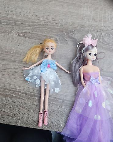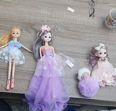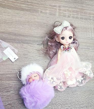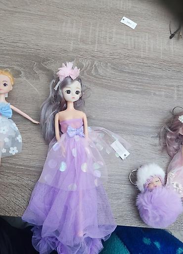 - Mini bal kukla: açıq-çəhrayı tüllü paltar, boyunda qaşlı yaxalıq, saçda iri mirvari qurdela. Uzun dalğalı açıq-bənövşəyi saçlar.