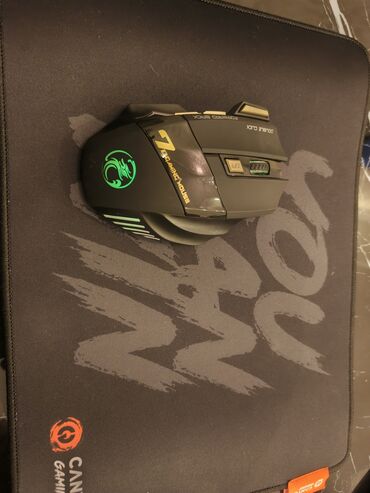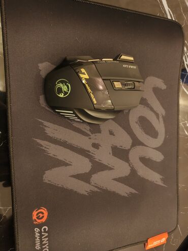 - Gaming mouse: 7 düyməli dizayn, yan panellərdə əlavə funksional düymələr, “Double Click” sürətli klik düyməsi, DPI tənzimləmə düyməsi (tək kliklə həssaslıq dəyişimi), skrol təkəri. Korpusda LED işıqlandırma (rəng dəyişən loqo və indikatorlar). Əl üçün ergonomik forma, baş barmaq dayağı. Üst hissədə “Reinforced back” yazılı möhkəm konstruksiya.