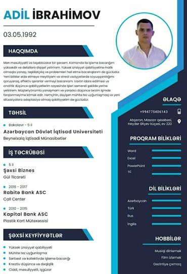 Kuriyer/kargüzar, paketçi–qablaşdırıcı işi axtarışı Təklif edilən xidmət: - Kuriyer və kargüzarlıq işi - Fabrik, zavod və sexlərdə istehsala aid paketləmə–qablaşdırma işi Bacarıqlar: - Azərbaycan...