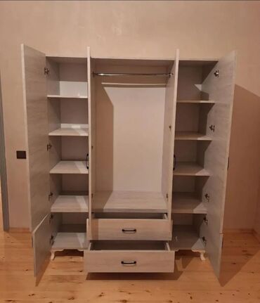 Yataq otağı üçün səliqəli və funksional saxlama həlli. Fərqli ölçü və rəng kombinləri ilə interyerə uyğunlaşdırıla bilər. Gündəlik istifadə üçün rahat asılqan zonası, iri güzgülər və həcmi geniş çekmecələr.