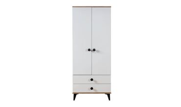 Minimalist ikiqapılı şkaf - Rəng: ağ (mat səth) - Dizayn: düz xətli, skandinav üslubunda; qara rəngli dairəvi tutacaqlar - Ayaqlar: konus formalı, qara, yüksəklik verən və təmizliyi asanlaşdıran d...