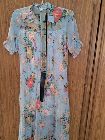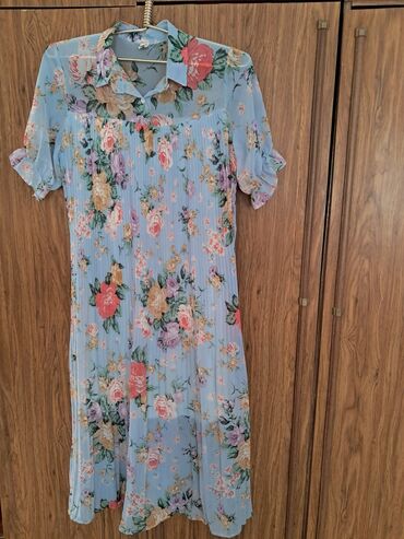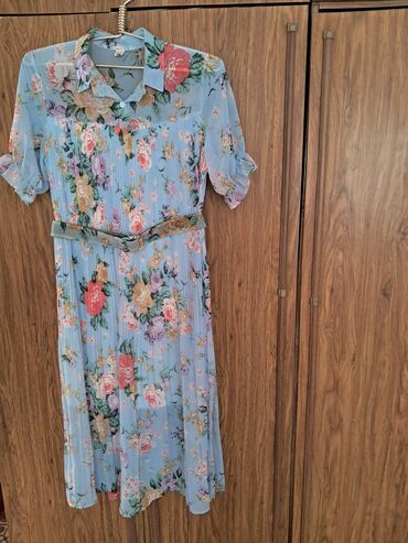 Qadın geyim dəsti – 2 ədəd paltar 1) Göy çalarlarında çiçək naxışlı midi paltar - Model: beldən yığma, ətəyi pliseli/klos kəsimli - Yaxa: balaca volanlı stend yaxa - Qol: 3/4–tam uzun şar (balon) ...