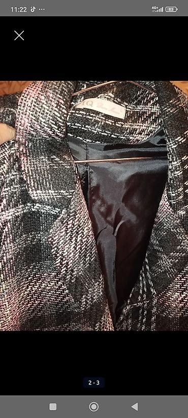 Qadın palto – boz rəng, xırda dama naxışlı parça. Dizaltı uzunluq, klassik geniş yatıq yaxa. İkiqat düymələnmə (4 ədəd metal düymə ön hissədə), içi atlas/astar ilə. Yanlarda iki dərin üçbucaqkəsim ...
