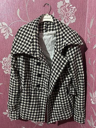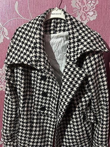 Qadın paltosu – qara-ağ “houndstooth” (quşdişi) naxışlı - Model: ikiqat düyməli (double-breasted) - Rəng: qara və krem-ağ kontrastlı naxış - Material: sıx toxunmuş parçadan (isti saxlayan, formaya...