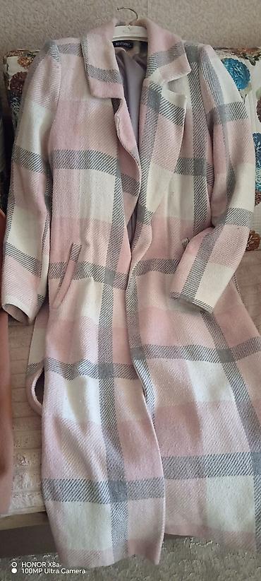 Qadın palto – krem rəngdə, qara detallarla. Turkiye istehsali - Dizayn: Klasik ikiqat düyməli (double-breasted) kəsim, geniş yaka, beldən yüngül oturan siluet. - Rəng və detalları: Krem əsas rəng,...