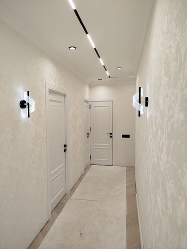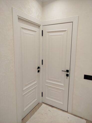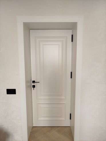 Ağ rəngdə, müasir üslubda hazırlanmış qapı. Qapı qara rəngdə qulp və kilidlə təchiz olunub. Həmçinin, qapı çərçivəsi də ağ rəngdədir və divardakı açıq rəngli divar kağızı ilə uyğunlaşır. Qapının üz...