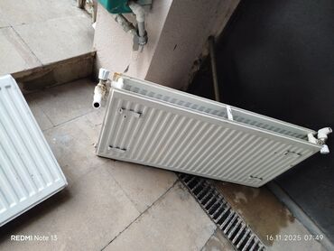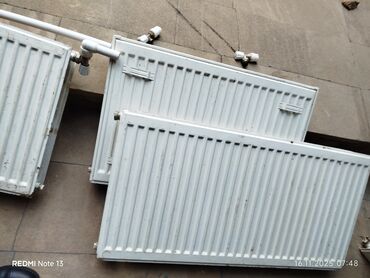 - Şəkillərdə real radiatorlar, bir neçəsinin üzərində termostatlı klapan və plastik boru birləşmələri görünür.