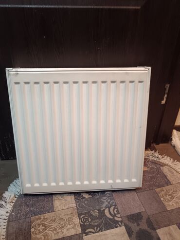 Panel tipli radiator (su ilə işləyən isitmə sistemi üçün) cüzi desyi var - Material: polad, ağ rəngli - Ölçü: təxminən 60–70 sm hündürlük, 60–70 sm en (şəkillərə əsasən) - Şaquli relyefli ön panel...