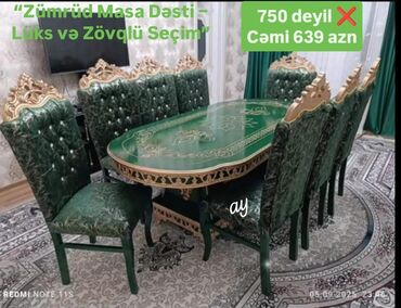 - “Zümrüd Masa Dəsti – Lüks və Zövqlü Seçim”: Zümrüd-yaşıl rəngli, oval formalı, ornamentli süfrə səthinə malik masa və uyğun stullar. Stulların arxalıqları zər ifrəli, qızılı dekor elementləri və düyməli tikişlə vurğulanıb; masa kənarlarında qızılı oymalar var. Dəst ümumi klassik-royal üslubdadır, geniş qonaq otaqları üçün uyğundur. Qiymət: 639 AZN (750 deyil).