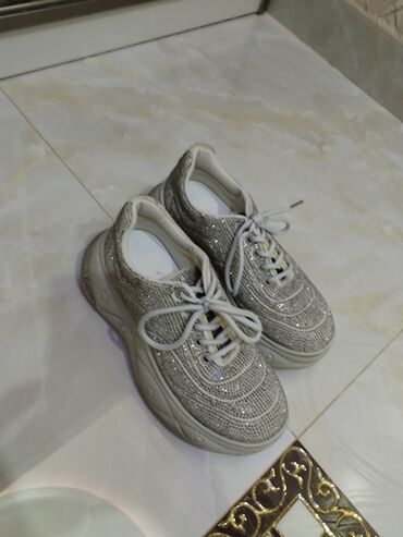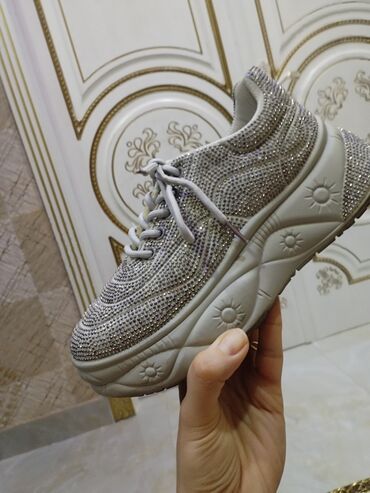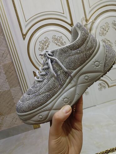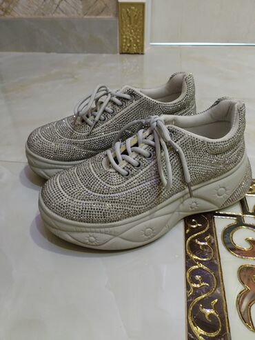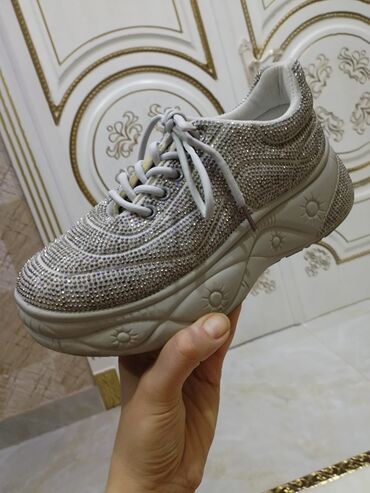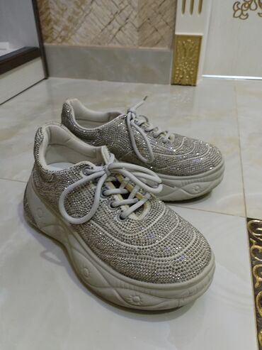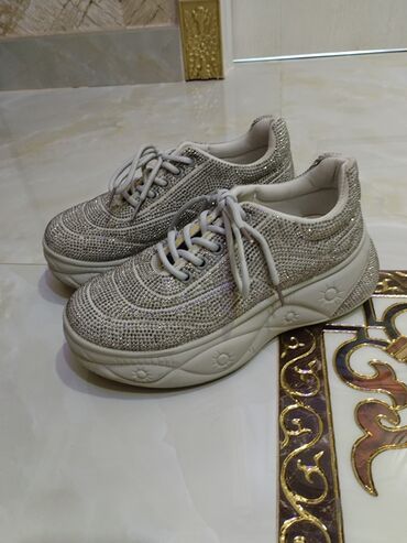 Parlaq daşlarla bəzədilmiş qadın krossovkaları - Rəng: krem/ivori tonlarında - Üst hissə: toxuma material və süet panellər - Bütöv səth boyu xırda parıltılı rhinestone daşlar - Bağlama: klassik ağ...