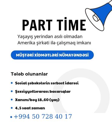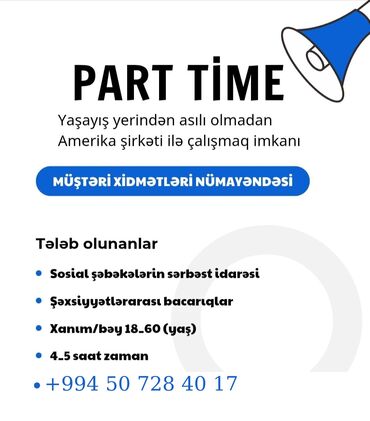 Vakansiya: Operator (bəy və xanım) Təsvir: - İş birbaşa şirkət tərəfindən təklif olunur (işə düzəltmə deyil) - İş rejimi: 4 saatlıq qrafik - Format: onlayn və ya əyani - Təcrübə tələb olunmur Maa...